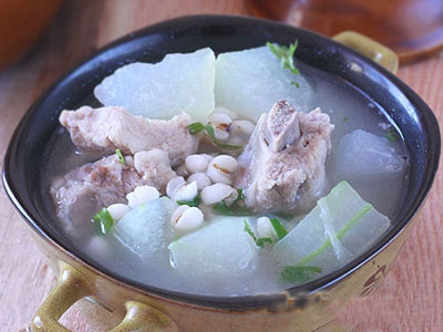 薏苡仁,芡实,白扁豆各15g,冬瓜150g,猪骨200g,生姜3片