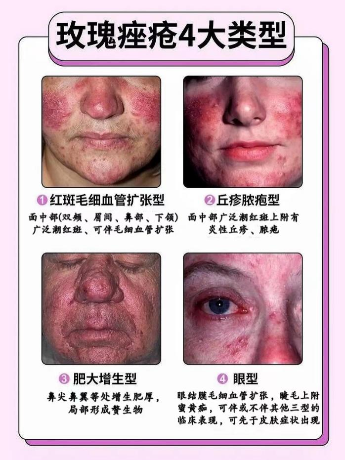对于红斑毛细血管扩张型患者,可外用药物结合屏障修复治疗,必要时也可采用激光治疗;如果出现丘疹-脓疱型表现,则需要医生处方不同药物(外用药和口服药)来治疗不同程度的病情。针对肥大增生型患者,病变早期可口服异维 A 酸治疗;而晚期鼻赘明显者,医生会建议选择激光消融术和外科手术治疗。眼型患者则建议同时到眼科配合治疗。