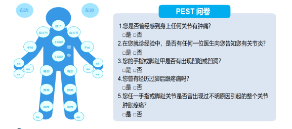 银屑病患者里大概有6%-13%的比例会出现关节受累,发展成关节病型银屑病。早期发现和治疗对于关节病型银屑病患者来说尤为重要。除了医生的诊疗水平、临床试验室指标、影像学指标帮助鉴别风湿性关节炎等关节病变外,大家可以认识一下PEST问卷,是用于快速筛查患者是否有关节病型银屑病的评估工具。