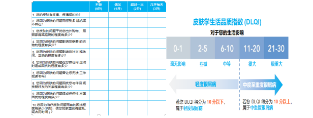 这个表格主要是测评银屑病对每天活动、穿衣、休闲活动、工作和上学、人际关系与治疗的影响,测评疾病对日常生活的影响程度,也能直观地反映出银屑病患者的治疗需求。