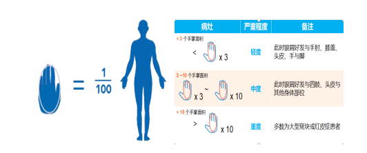体表面积(BSA)自测方法可以计算银屑病皮损面积的大小,它指银屑覆盖身体的百分比,测量方法比较简单,用患者自身手掌面积自测皮损面积,用时也比较短。学会了之后,能够简单自评银屑病严重程度。