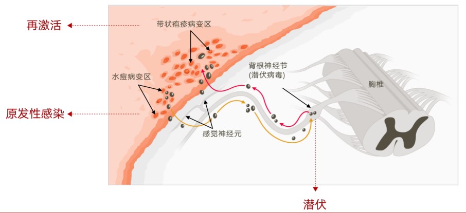 带状疱疹的病原是水痘—带状疱疹病毒,它是一个皮肤界著名的“潜伏者”。人体首次感染后,表现水痘,水痘治好后,病毒并不会随之消失,而是潜伏在脊神经后根或者神经节的神经元内。当人体在某些外因:如疲劳、外伤等作用下,这个“潜伏者”就伺机而动,生长繁殖,使受侵犯的神经节发生炎症,出现疼痛,同时,病毒沿着神经传播到皮肤,产生群集的水疱。