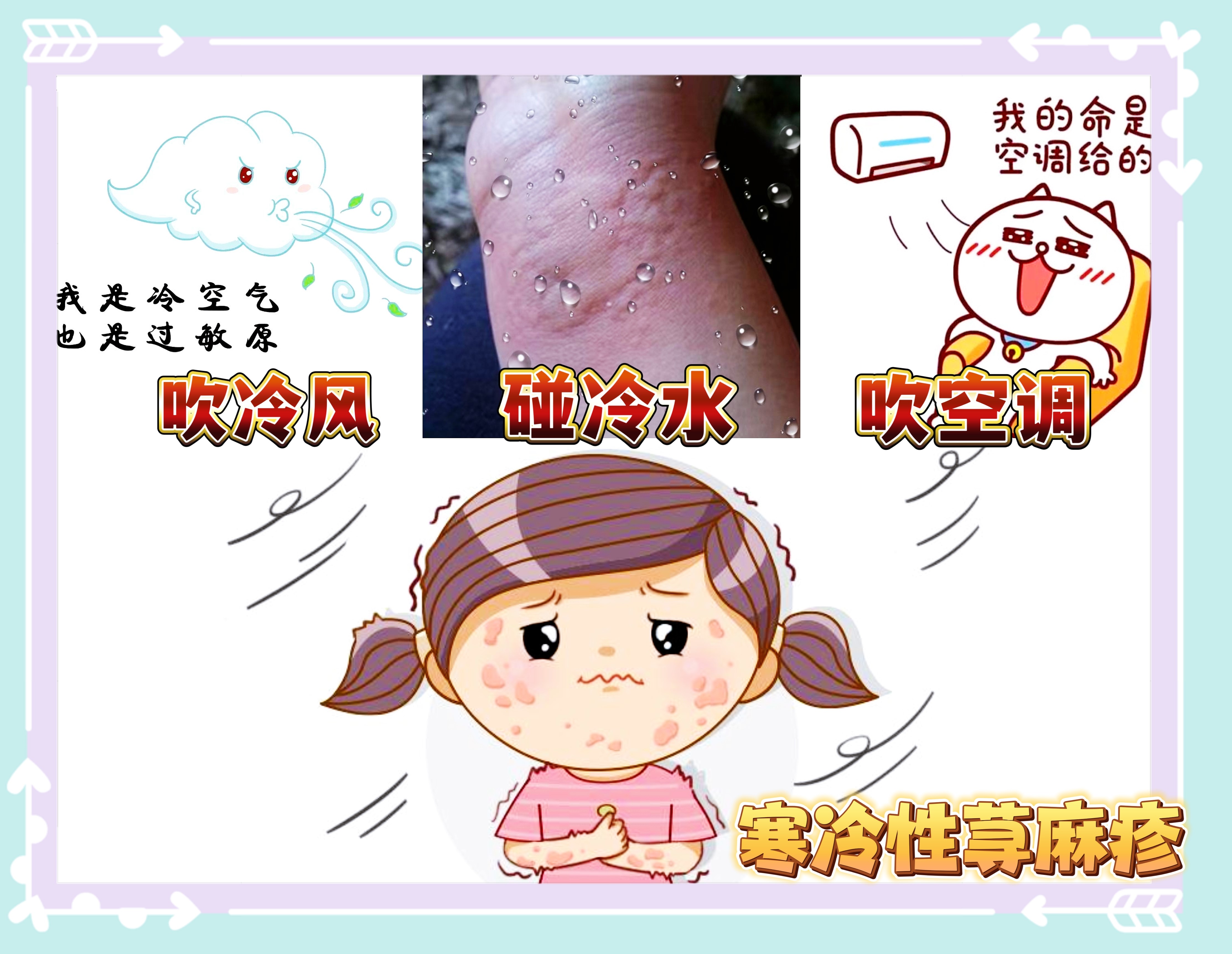 寒冷性荨麻疹是慢性荨麻疹的一种特殊类型,是皮肤在接触冷空气、冷液体、冷固体后数分钟内出现红斑、风团,可持续数分钟至数小时。严重者可出现全身性症状,包括过敏性休克。寒冷性荨麻疹的自然病程较长,50%的患者可以逐渐自然缓解,或至少在5~6年内症状有所改善。复发的情况比较少见,但部分患者仍可能在数年后出现复发。寒冷性荨麻疹的防护在于注意保暖,避免长时间接触冷风冷水,避免频繁暴露在冷热交替的环境中,避免进食过热食物或冷饮。还有一点特别要注意,炎炎夏日,空调的使用避不可少,但在空调环境中,此类患者也要注意保暖,避免直对风口,减少诱发症状。