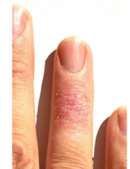 皮损初为多数密集的粟粒大小的丘疹、丘疱疹或小水疱,基底潮红,逐渐融合成片,由于搔抓,丘疹、丘疱疹或水疱顶端抓破后呈明显的点状渗出及小糜烂面,边缘不清。自觉剧烈瘙痒。好发于头面、耳后、四肢远端、阴囊、肛周等,多对称发布。
