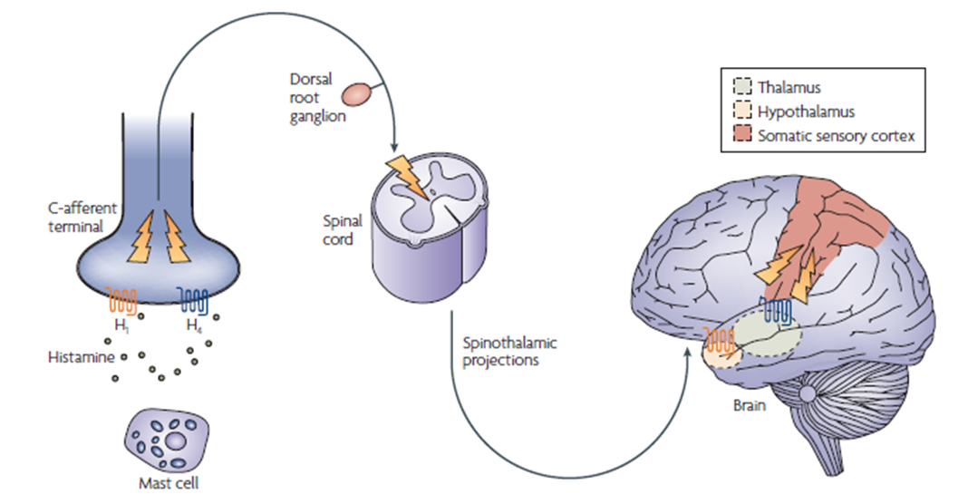 瘙痒是一种常见的、引起抓挠欲望的、令人不快的皮肤感觉,是多种炎症性皮肤病及系统性疾病的典型临床表现。瘙痒感受器,起源于真皮与表皮连接处的无髓鞘C纤维游离神经末梢。它在受到刺激后会产生瘙痒的感觉,瘙痒通过感觉神经传导至脊髓,通过脊髓丘脑束到达丘脑,最后到达大脑感觉皮层,引起痒觉,从而刺激摩擦或抓痒反射。