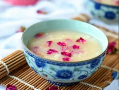 配方:玫瑰花3朵,大米(可用小米或粳米替代)60g,枸杞子10g,冰糖适量。