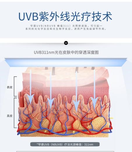 目前认为窄谱中波紫外线NB-UVB是家用紫外线光疗最佳选择的波段。家用的308nm准分子光起效更快。