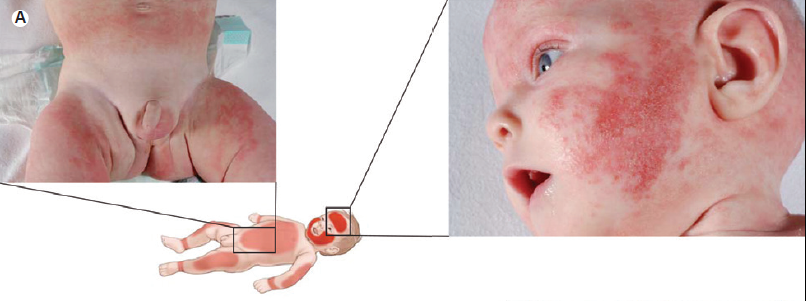 表现为婴儿湿疹,多见于面颊、额头和头皮等处。