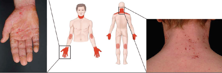 与儿童期类似,主要累及肘窝和腘窝,亦可累及面颈部及手足,皮损可浸润肥厚而呈苔藓样变。